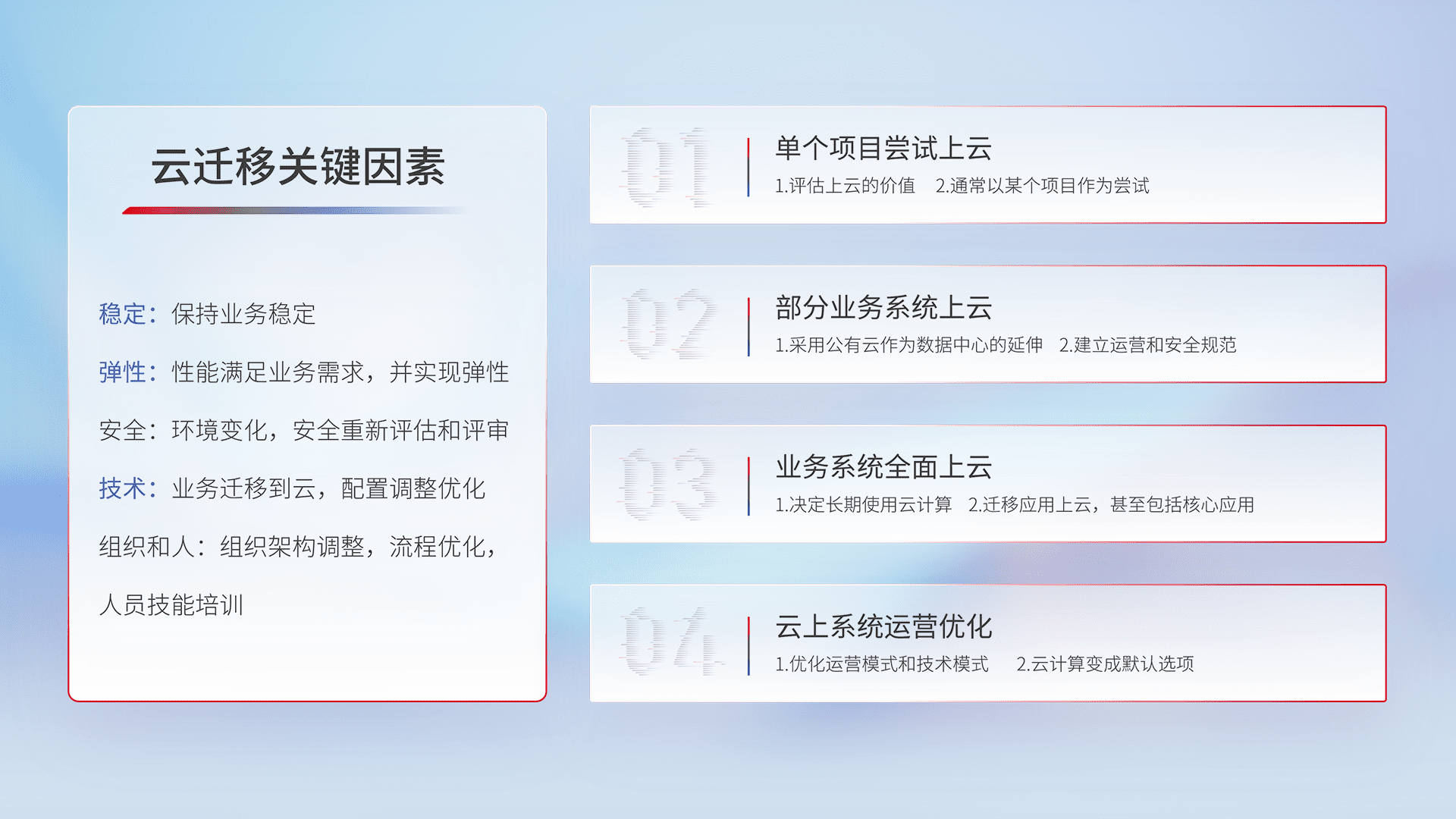 结合实际业务,,从规划设计、、、云平台选型、、、、云原生改造、、数据迁移、、、集成交付,,,,迁移全过程为客户识别最佳上云路径,,,,做好风险识别管理,,,,设计网络架构、、身份权限、、、安全审计合规、、操作审计、、、日志审计、、、监控告警策略、、、多站点容灾设计等,,,,对云上基础设施进行整体规划,,提升IT治理水平,,,以满足弹性、、、高可用、、高性能的需求。。。