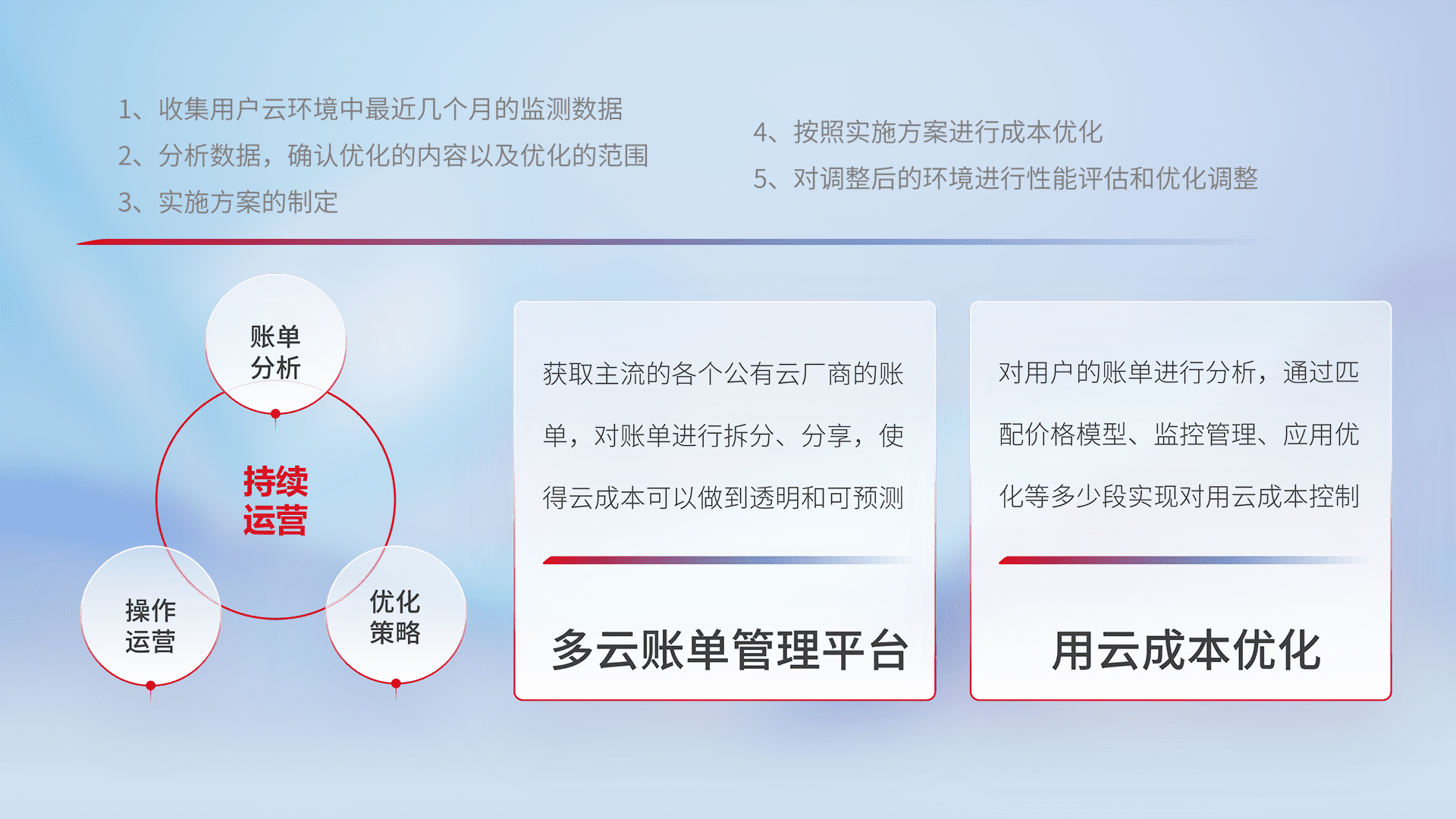 通过多云纳管,,,以统一的资源数据模型把客户的云资源进行抽象和封装,,进而实现对多云资源的统一操作,,保障云资源管理的可靠性、、、、稳定性与可用性。。。量身定制化运维内容,,,配置、、、、开发运维、、补丁管理、、、、备份、、监控、、认证和访问管理、、、审计和日常巡检等,,保障在用云过程中的可靠度,,,,稳定度以及高可用率。。